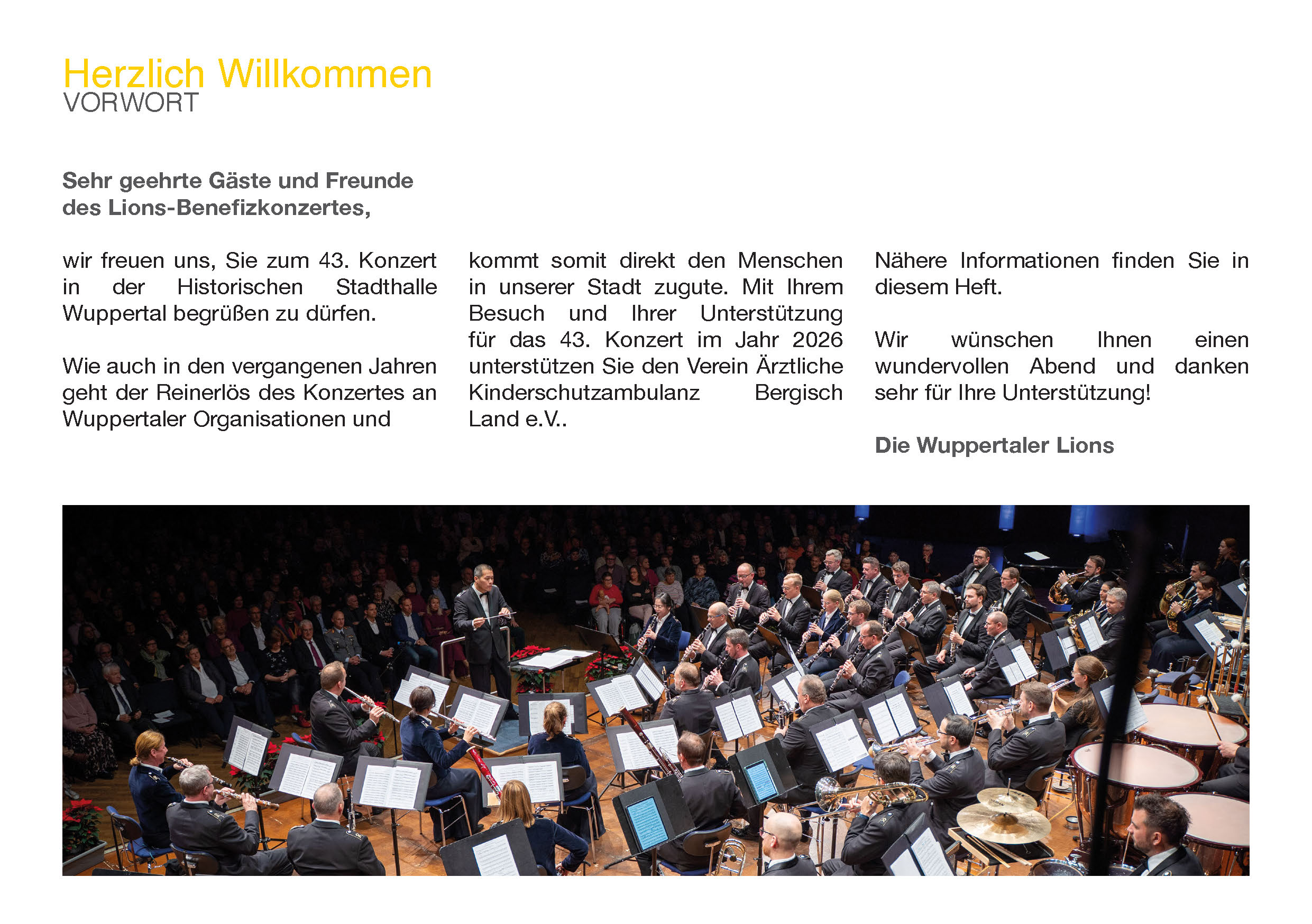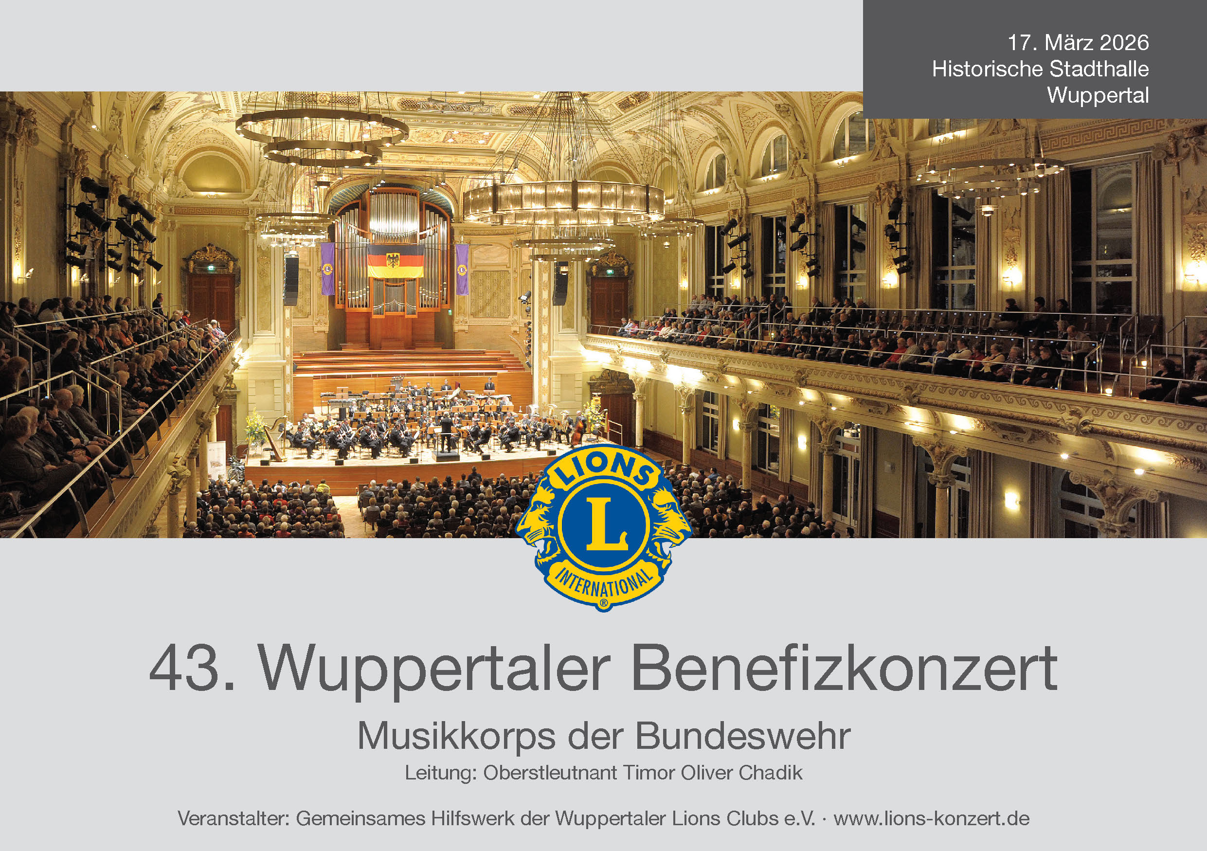 am 17. März 2026 findet das 43. Lions-Benefizkonzert mit dem Elite-Musikkorps der Bundeswehr in der Historischen Stadthalle Wuppertal statt.